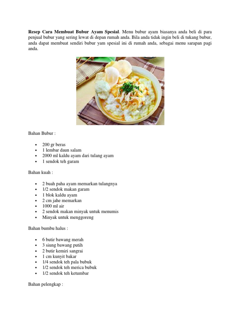 People are more familiar with turmeric as a spice used for cooking resep bubur ayam terbaru in the kitchen spice supplement. Some dishes that contained the material component of turmeric curry and soup for example, precisely to give a yellow color to the dish. Breakfast can range from light menu like oats or loafs, to heavier ones like fried rice. Superbubur.com merupakan portal bisnis, portal kuliner serta portal narsis indonesia. Taking an analogy from the world of music, bubur ayam is an orchestra, and not a single piece.